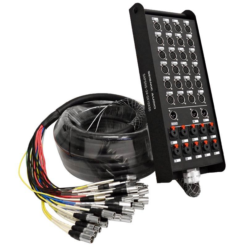 The SAPSNS series of Seismic Audio snake cables were designed to match up perfectly with the Presonus StudioLive Digital Mixers, as well as other popular mixers.. The SAPSNS-24-3x10 series is an ideal snake for those that own the Presonus StudioLive 24.4.2 Digital Mixer. This snake box and fantail matches up perfectly with the connectors on the back of the Presonus 24.4.2. This snake has 24 XLR inputs, 3 XLR Outputs (Two for your Main Outputs and one for your Mono Output), and 24 TRS 1/4" Aux outputs. Great for studio or live performances. These snakes provide maximum flexibility by offering both XLR and 1/4" connections for the returns. High quality XLR connections, easy to read color coded wires on the fantail. Rugged steel box to withstand the rigors of the road. 22g Oxygen-Free Copper (OFC) conductors for enhanced signal clarity and superior RF rejection.