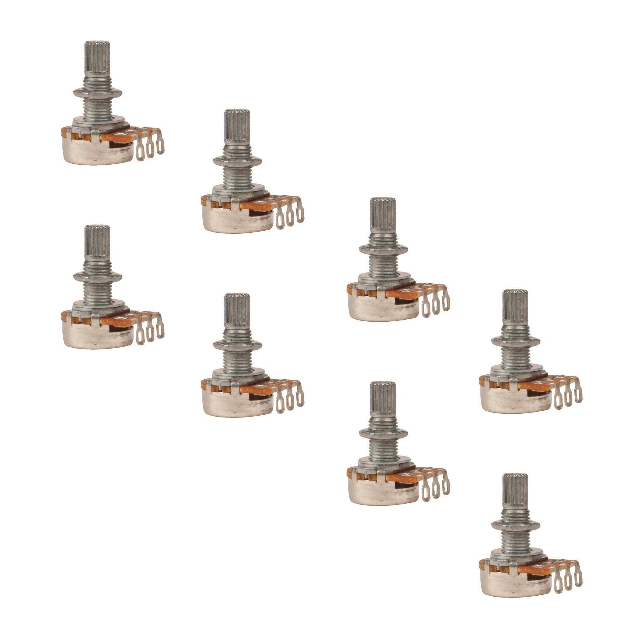 Ideally suited for single coil pickups, this 8 pack of Replacement Volume Pots produce a warm sound to complement low-output guitars. Easy to use solder lugs make installation a snap. The coarse knurled shaft will accept most knobs. This Replacement Volume Pot is designed for electric guitars from any manufacturer. That includes Fender, Gibson, Ibanez, Epiphone, Squier, ESP, Paul Reed Smith, Jackson, Yamaha, BC Rich, Schecter, Ernie Ball, and many more.Measurements:6mm Knurled Shaft, will fit most standard 6mm push-on knobs.Shaft Length: 25/64" (10mm)Bushing Size: 17/64" (6.8mm)Diameter X 1/4" (6.35mm) Length Mounting Hole: 17/64" (6.8mm)Total Length(Top of Shaft to Bottom of Pot): 1-1/16" (27.45mm)Base Diameter: 3/4" (19mm) Includes Dust Seal