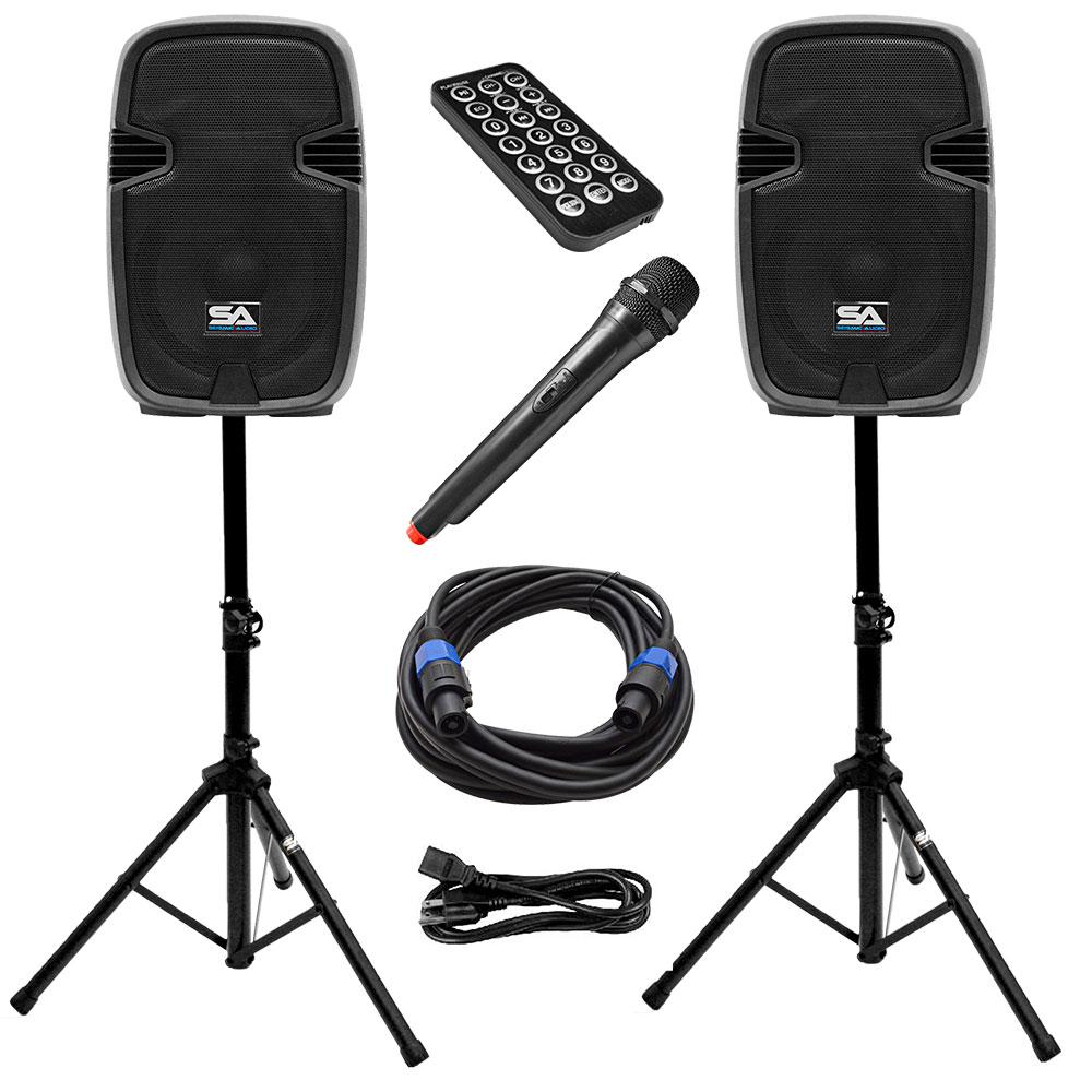 In this package you get two 12" PA/DJ speakers, one active and one passive. The active speaker has a built in amplifier to power the passive. A 20' Speakon cable is included to connect the two speakers. Combined, these speakers put out an amazing 1600 watts of power. Also included in this package is a pair of Speaker Stands, a Wireless Microphone, Remote Control and Power Cable.