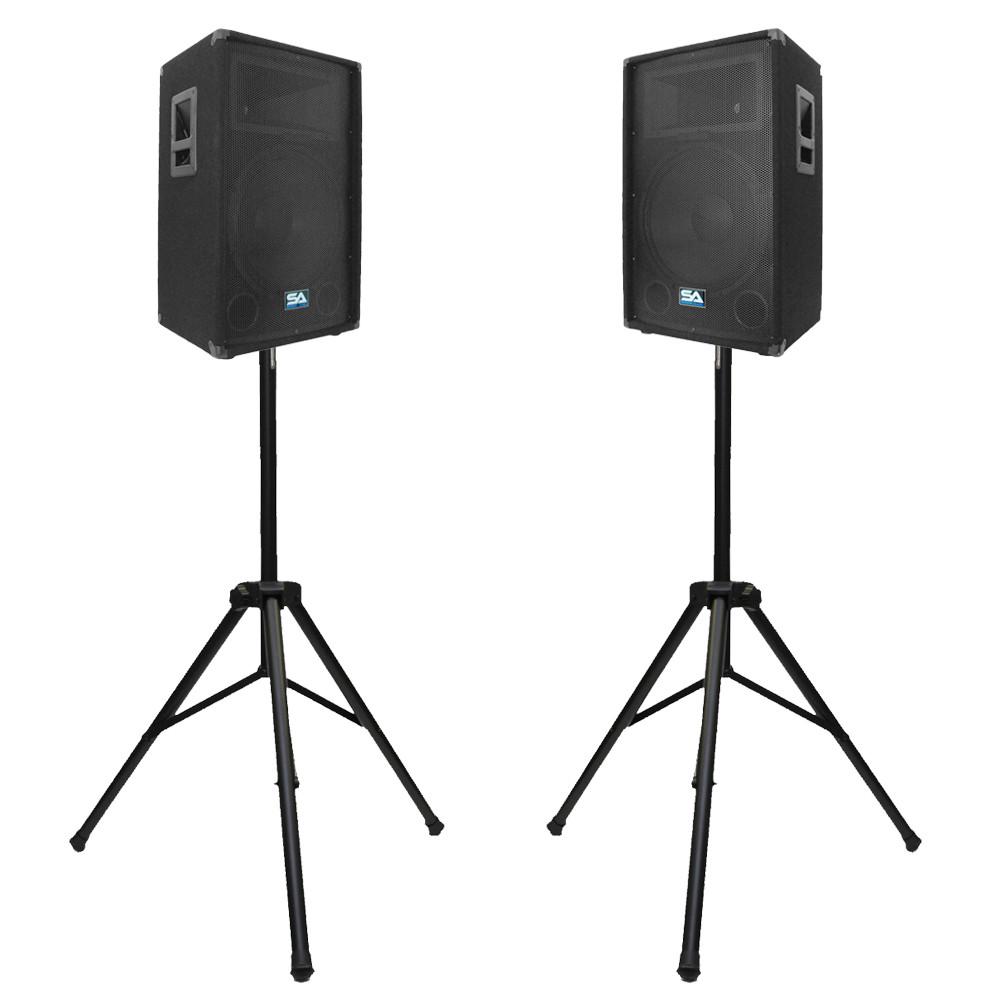 Pair of 12" PA Speakers with two Tripod Speaker Stands