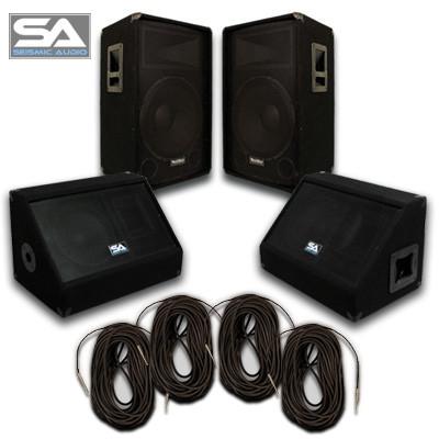 Pair of 15" Speaker Mains, Pair of 10" Floor Monitors, and Four Cables