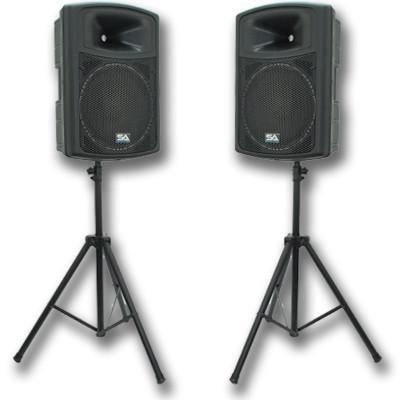 Pair of Powered 15" PA DJ Molded Speakers with Speaker Stands