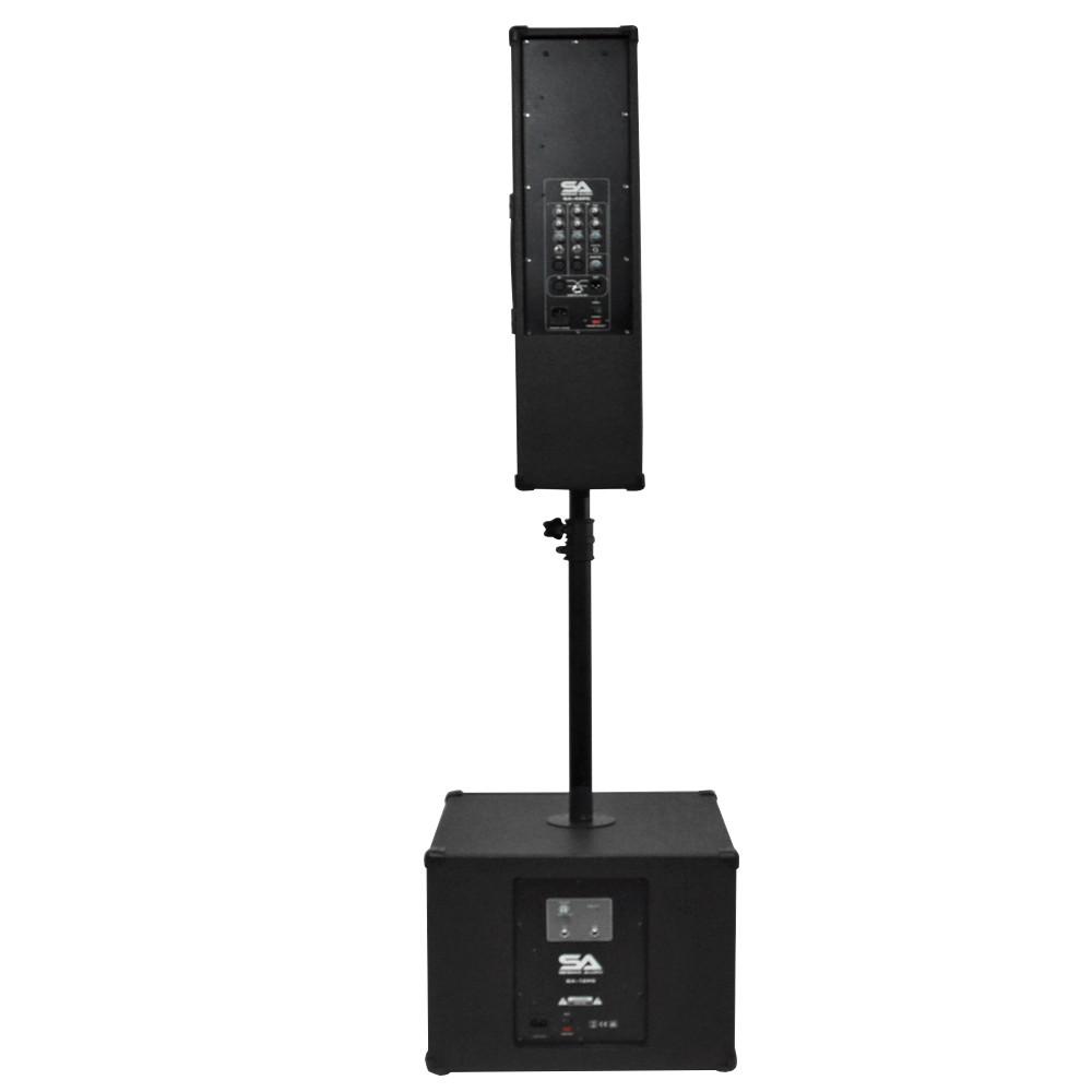 This powered portable PA system consists of two main components. The SA-45PC is a 4x5 Inch Active Column Speaker that operates at 200 Watts RMS and houses four 5 Inch drivers and a 1" Compression driver. It has a built in amplifier with a mixer that allows you full control and gives you the option of using the column speaker as a lightweight and portable full range speaker. The second is the SA-12PC. This 12 Inch Active Subwoofer operates at 250 Watts RMS and houses a 12 Inch subwoofer. It has a built in amplifier with master volume control and gives you the the low range sound you need for a full range system. The 4x5 Column Speaker has a linking system that create a simple integration for hooking the two together. This portable PA system is so versatile that you can use the top without the subwoofer engaged and use it as a full range speaker. All these features make the SA-CPPA1 the ideal solution for you powered portable PA system needs