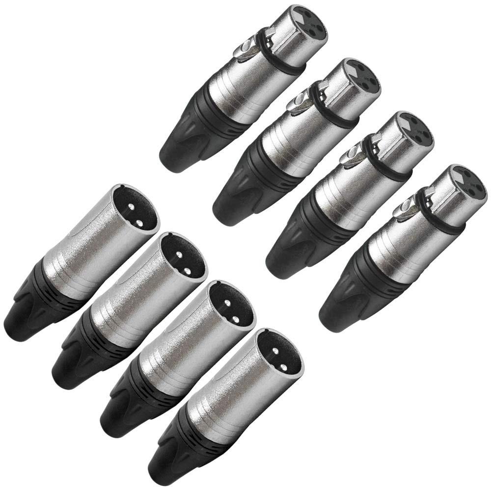 Four XLR Male and Four XLR Female Cable ConnectorsYou can never have too many adapters in your toolbox. These connectors are great for a quick fix or when you are in a pinch and need to convert a cable. Awesome quality connectors are very hard to find, especially at a decent price. With your purchase, you will receive four 3 pin male XLR connectors and four 3 pin female connectors pictured and described. So, put it in your cart today and get ready for years of trouble-free, crystal clear sound!