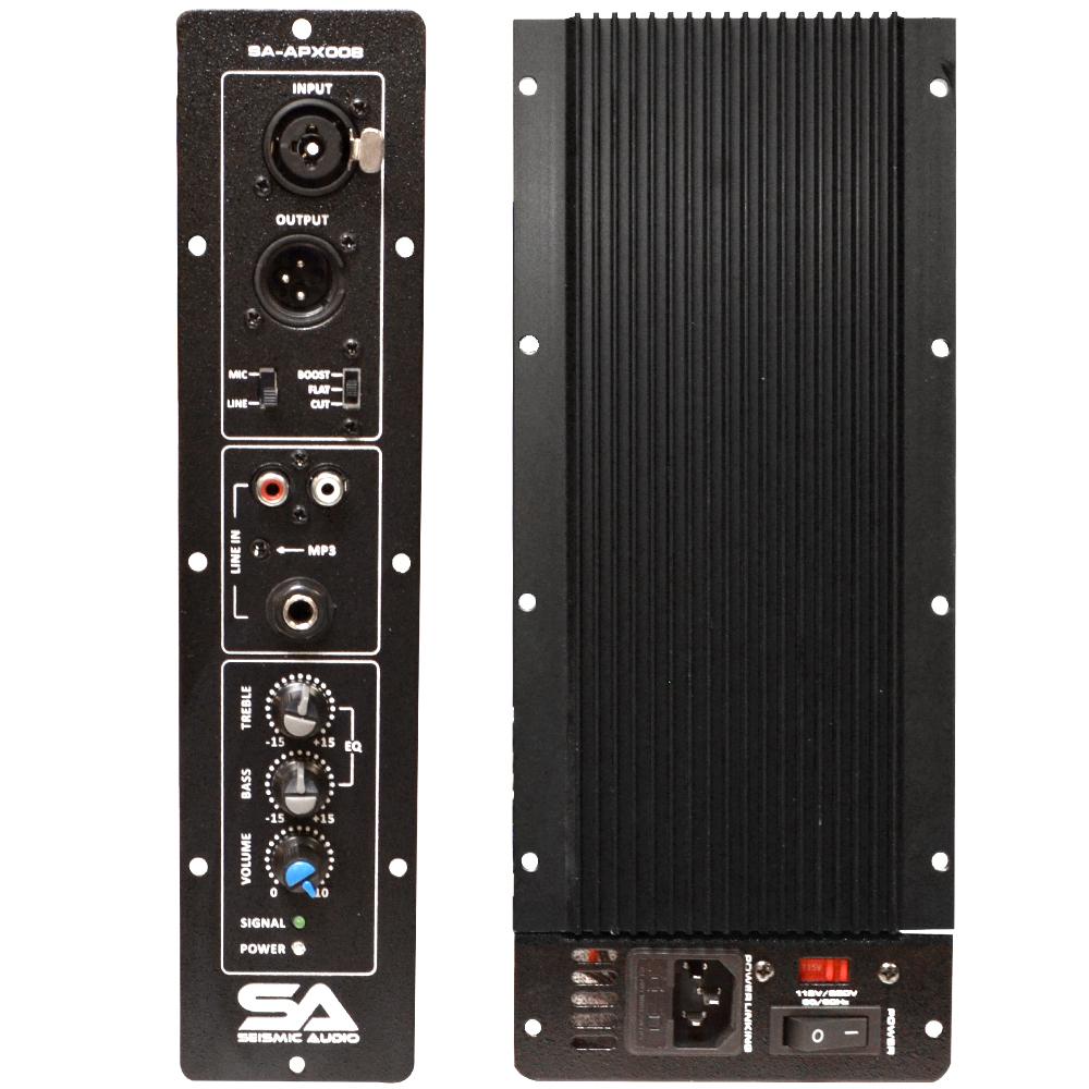 Seismic Audio's line of Plate Amplifiers gives you the ability to build your own powered speaker cabinets and powered subwoofer cabinets. The SA-APX008 is a 2 piece Class AB amplifier designed for Full Range Loudspeaker enclosures. It has a power rating of 100 Watts RMS and 200 Watts Peak. This amp has Treble, Bass, and Master Volume controls, a Mic/Line Switch, a Switch for Boost/Flat/Cut as well as over current and overload protection. When paired with the right speaker driver and enclosure, these plate amplifiers produce the loud, clear, and clean sound to reinforce your PA loudspeaker system. With your purchase, you will receive one 100 Watt Class AB Plate Amplifier pictured and described above.