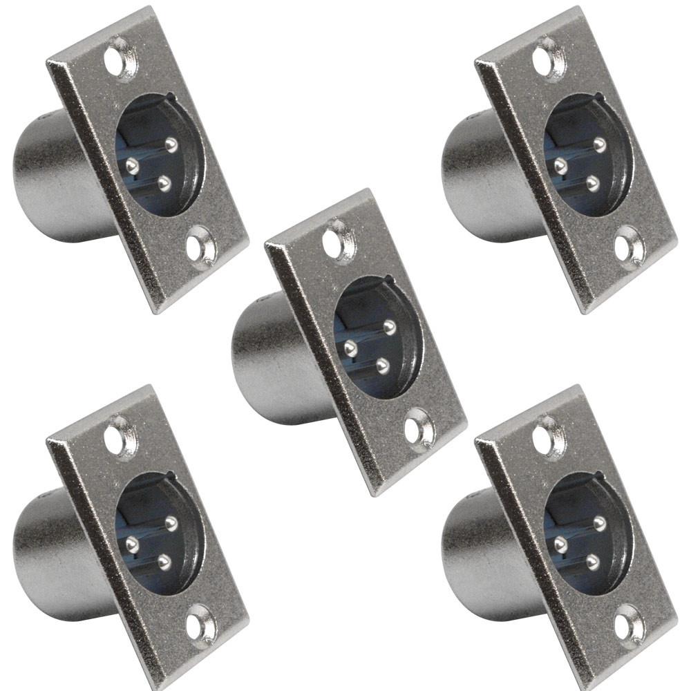 XLR Male Nickel Panel Mount Connectors - 5 PackYou can never have to many of these connectors in your toolbox. When you are ready to expand the number of channels needed for your next recording studio project, these connectors are an ideal fit. These male connectors can be panel or chassis mounted. It has a rectangle panel mount and will mount in 19.45mm diameter holes. With your purchase, you will receive 5 XLR Male Nickel Panel Mount Connectors pictured and described. So, put it in your cart today and get ready for years of trouble-free, crystal clear sound!